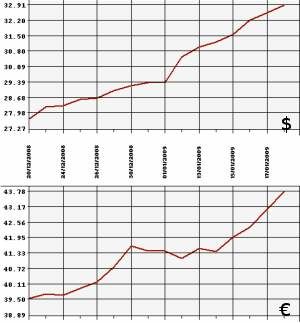 Банк России на 20 января 2009 года повысил официальный курс доллара США к рублю до 32,9085 рубля, а курс евро - до 43,7815 рубля. На торгах ММВБ 19 января средневзвешенный курс доллара с расчетами "завтра" составил 32,9912 рубля, курс евро - 43,7101 рубля.