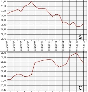 Банк России на 23 июля 2010 года понизил курс евро до 38,9503 рубля, а курс доллара США к рублю повысил - до 30,5205 рубля. На торгах ЕТС ММВБ средневзвешенный курс евро с расчетами "завтра" упал до 39,0843 рубля, курс доллара вырос до 30,4864 рубля.
