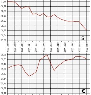 Банк России на 5 августа 2010 года понизил курс доллара США к рублю до 29,7958 рубля, курс евро - до 39,3781 рубля. На торгах ЕТС ММВБ средневзвешенный курс доллара расчетами "завтра" опустился до 29,8214 рубля, курс евро - до 39,3830 рубля.По данным ЦБ РФ, на 5 августа официальный курс доллара США к рублю понижен более чем на 17 копеек - с 29,9681 рубля до 29,7958 рубля. Официальный курс евро составил 39,3781 рубля, что на 7 копеек с лишним ниже предыдущей цены (39,4500 рубля 4 августа).