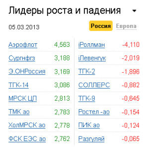 Опережающими темпами росли котировки акций "Аэрофлота" (+4,56%), "Сургутнефтегаза" (+3,19%), "Э.ОН Россия" (+3,17%), ТГК-14 (+3,09%), "МРСК Центра и Привожья" (+2,81%) и ТМК (+2,78%).