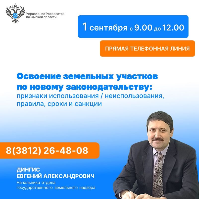 1 сентября с 9:00 до 12:00 Управление Росреестра по Омской области проведит прямую линию, посвященную освоению садовых, огородных и расположенных в границах населенных пунктов земельных участков по новому законодательству.