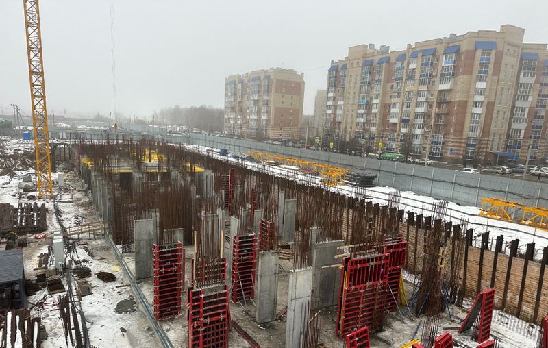 Сейчас на строительной площадке первого жилого корпуса ведутся монолитные работы. В разных секциях готовность железобетонных конструкций цокольного этажа составляет от 15 % до 75 %.