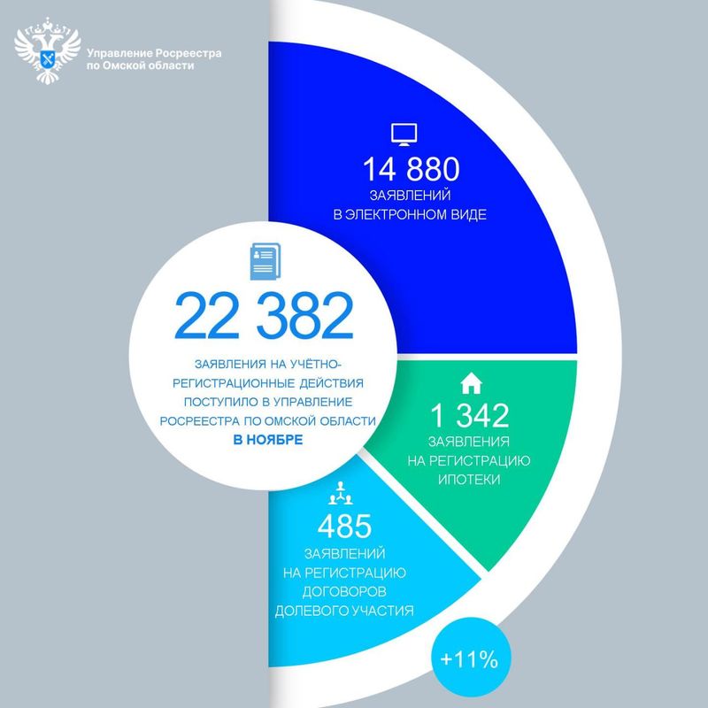 Количество заявлений на регистрацию ипотеки по итогам прошлого месяца составило 1342, из них 77 % (1027) – в электронном виде. В октябре ипотек омичи оформили на 9 % больше – 1474.