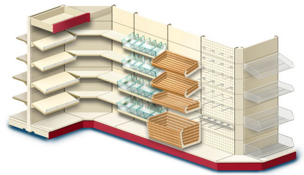 При различных форматах торговой площади, стеллажи торговые для магазина могут быть интегрированными - (встраиваемые в складской стеллаж серии G50). Данная комбинация стеллажей складской + торговой серии, позволяют использовать торговое помещение с максимальной загрузкой, на верхних ярусах располагается складской запас, а на нижних сами товары. Пристенные стеллажи располагаются вдоль стен помещения и имеют в среднем высоту 2.4 метра, а островные стеллажи располагаются по центру зала и обычно бывают высотой до 1.8 метра.