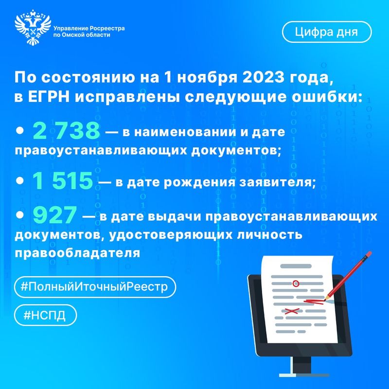 Исправлены допущенные при приеме документов ошибки в сведениях о наименовании 2 519 правоустанавливающих документов, о дате 219 правоустанавливающих документов, о дате выдачи 927 документов, удостоверяющих личность правообладателя, а также о дате рождения 1 515 заявителей. Из ЕГРН исключены сведения о 10 796 объектах недвижимости, которые носили временный характер.