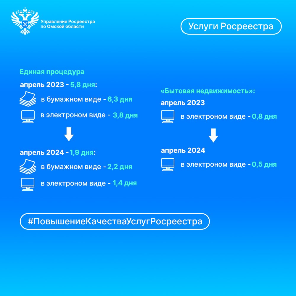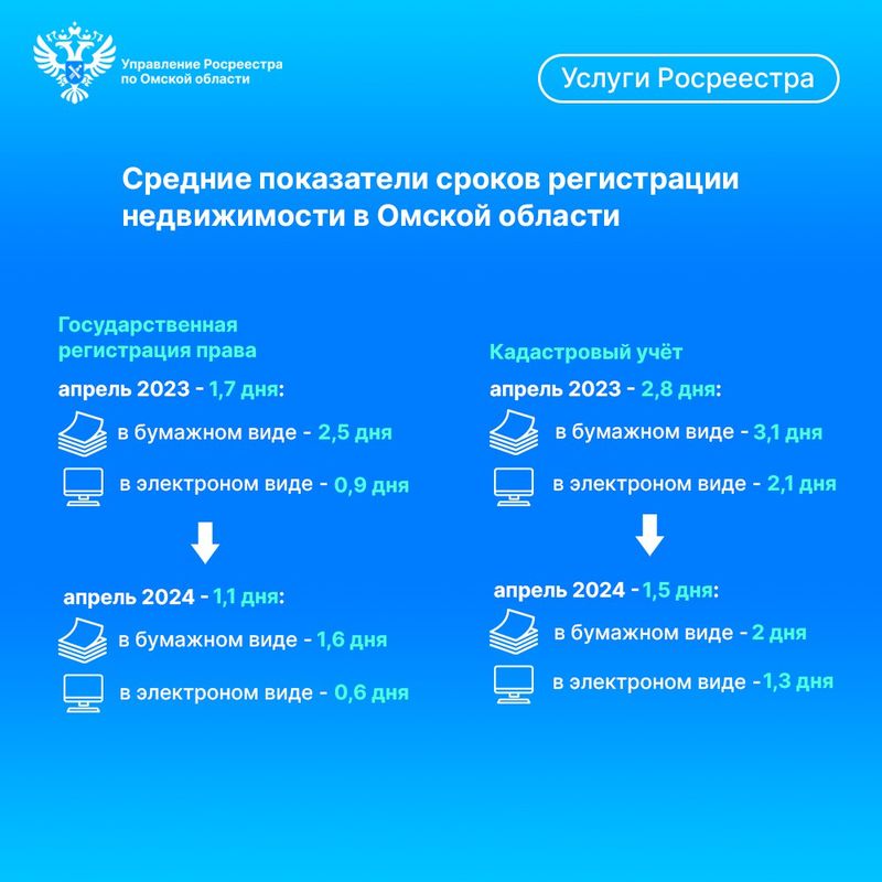 В настоящее время кадастровый учет объектов недвижимости государственными регистраторами Управления Росреестра по Омской области осуществляется в срок 1,5 дня (документы, поданные в бумажном виде, – 2 дня, в электронном виде – 1,3 дня). В апреле 2023 года – 2,8 / 3,1 / 2,1 дня соответственно.