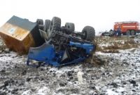 От столкновения КАМАЗ перевернулся, а водитель "легковушки" и его пассажиры погибли.