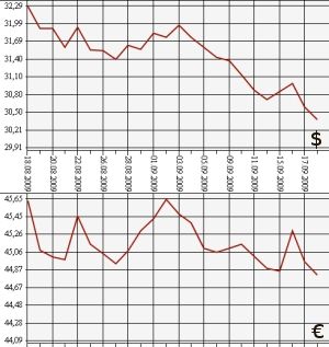 Результаты единой торговой сессии межбанковской валютной биржи показали аналогичную динамику. По итогам торгов ЕТС на ММВБ 17 сентября, средневзвешенный курс доллара США с расчетами "завтра" упал почти на 26 копеек - с 30,6042 рубля до 30,3458 рубля. Средневзвешенный курс евро также стал ниже - более чем на 23 копейки, с 44,9504 рубля до 44,7186 рубля.