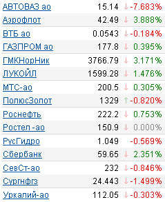 В пятницу произошел ожидаемый инвесторами "отскок", в результате ММВБ вышел в положительную зону. По итогам торгового дня подорожали бумаги "Газпрома" (+0,4% на ММВБ), "Лукойла" (+1,5%), "Норникеля" (+3,2%), "Роснефти" (+0,8%), "Газпром нефти" (+0,3%), "Сбербанка России" (+2,4% и +2,47 на РТС). Подешевели акции ВТБ (-0,2% и -8,6% в РТС), "Сургутнефтегаза" (-1,5% и 1,72%), "Татнефти" (-0,04%), "Полюс Золота" (-0,8%).