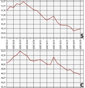 Центробанк на 26 сентября 2009 года повысил курс доллара США до 30,1370 рубля, а курс евро, напротив, понизил - до 44,2562 рубля. На торгах ЕТС ММВБ средневзвешенный курс доллара с расчетами "завтра" вырос до 30,1158 рубля, курс евро снизился до 44,2066 рубля.