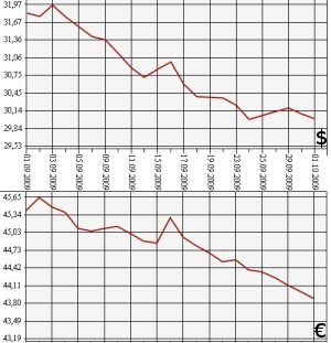 Банк России на 1 октября 2009 года понизил курс доллара США до 30,0087 рубля и курс евро - до 43,8877 рубля. На торгах ЕТС ММВБ средневзвешенный курс доллара с расчетами "завтра" упал до 30,0218 рубля, курс евро вырос до 43,9475 рубля.