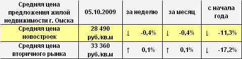 По данным журнала "Недвижимость" (ИД "Премьер") на 5 октября 2009 года, за неделю стоимость одного квадратного метра жилья на первичном рынке упала на 110 рублей (-0,4%) и достигла в среднем по городу 28 тысяч 490 рублей. Таким образом, за месяц цена "квадрата" опустилась на 120 рублей (-0,4%), а с начала года - на 3640 рублей (-11,3%). За последние 12 месяцев потери рынка оцениваются в 18,4% или 6440 рублей "с метра".