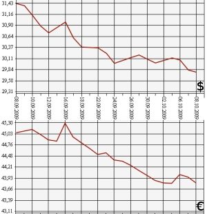 Банк России на 8 октября 2009 года понизил курс доллара США к рублю до 29,7819 рубля, а курс евро - до 43,8211 рубля. На торгах ЕТС ММВБ средневзвешенный курс доллара с расчетами "завтра" также упал до 29,7628 рубля, курс евро - до 43,7664 рубля.