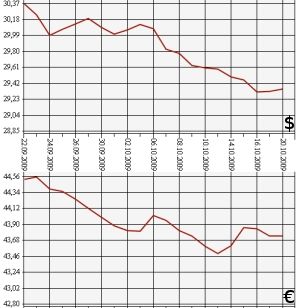 По данным ЦБ РФ, на 20 октября официальный курс доллара США к рублю повышен более чем на 2 копейки - с 29,3281 рубля до 29,3553 рубля. Официальный курс евро составил 43,7453, что менее чем на 1 копейку выше предыдущей цены - 43,7429 рубля 19 октября. Стоимость бивалютной корзины (0,45 евро и 0,55 доллара) выросла почти на 1 копейку с лишним - с 35,8148 рубля до 35,8308 рубля.