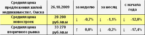 По данным журнала "Недвижимость" (ИД "Премьер") на 26 октября 2009 года, за неделю стоимость одного квадратного метра жилья на первичном рынке упала на 190 рублей (-0,7%) и достигла в среднем по городу 28 тысяч 280 рублей. Таким образом, за месяц цена "квадрата" опустилась на 320 рублей (-1,1%), а с начала года - на 3850 рублей (-12,0%). За последние 12 месяцев потери рынка оцениваются в 18,3% или 6350 рублей "с метра".