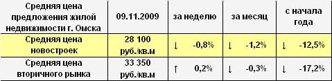 По данным журнала "Недвижимость" (ИД "Премьер") на 9 ноября 2009 года, за неделю стоимость одного квадратного метра жилья на первичном рынке упала на 240 рублей (-0,8%) и достигла в среднем по городу 28 тысяч 100 рублей. Таким образом, за месяц цена "квадрата" опустилась на 330 рублей (-1,2%), а с начала года - на 4030 рублей (-12,5%). За последние 12 месяцев потери рынка оцениваются в 18,3% или 6310 рублей "с метра".