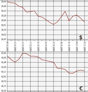 Банк России на 7 ноября 2009 года понизил курс евро до 43,1578 рубля, а курс доллара США - до 29,0156 рубля. На торгах ЕТС ММВБ средневзвешенный курс евро с расчетами "завтра" упал до 43,1127 рубля, а курс доллара - до 28,9831 рубля.