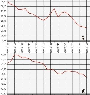 Центробанк на 13 ноября 2009 года понизил курс евро к рублю до 42,9134 рубля, а курс доллара США - до 28,6701 рубля. На торгах ЕТС ММВБ средневзвешенный курс евро с расчетами "завтра" уменьшился до 42,9622 рубля, курс доллара вырос до 28,7213 рубля.