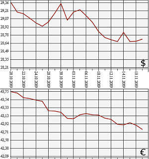 Таким образом, стоимость "официальной" бивалютной корзины (0,45 евро и 0,55 доллара) понизилась более чем на 2 копейки - с 35,0749 рубля до 35,0470 рубля. "Биржевая" бивалютная корзина стоит 35,0624 рубля.
