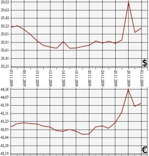 Банк России на 2 декабря 2009 года повысил курс доллара США до 29,1771 рубля, а курс евро - до 43,8736 рубля. На торгах ЕТС ММВБ средневзвешенный курс доллара с расчетами "завтра" упал до 29,1347 рубля, курс евро вырос до 43,8840 рубля.