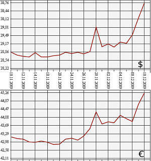 Как сообщает Банк России, на 10 декабря официальный курс доллара США к рублю установлен на уровне 30,7562 рубля, что более чем на 57 копеек выше курса предыдущего дня - 30,1839 рубля. Одновременно более чем на 54 копейки повышен курс евро к рублю - с 44,7174 рубля до 45,2608 рубля.