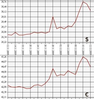 По данным ЦБ РФ, на 12 декабря официальный курс доллара США к рублю понижен более чем на 41 копейку - с 30,6268 рубля до 30,2107 рубля. Курс евро к рублю составил 44,4913 рубля, что более чем на 58 копеек ниже предыдущей цены - 45,0735 рубля 11 декабря. Соответственно бивалютная корзина подешевела на 49 копеек с небольшим - с 37,1278 рубля до 36,6370 рубля.