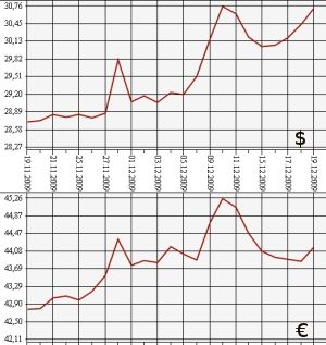 Центробанк РФ на 19 декабря 2009 года повысил курс доллара США до 30,7187 рубля, евро - до 44,1766 рубля. На торгах ЕТС ММВБ средневзвешенный курс доллара с расчетами "завтра" вырос до 30,6637 рубля, евро уменьшился до 44,0569 рубля.