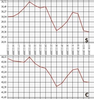 Центробанк на 13 января 2010 года понизил курс доллара США до 29,3774 рубля, курс евро - до 42,6149 рубля. Средневзвешенный курс доллара США с расчетами "завтра" на ММВБ вырос до 29,4240 рубля, евро уменьшился до 42,6321 рубля.