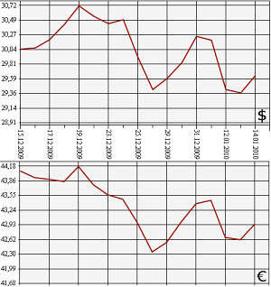 Банк России на 14 января 2010 года повысил курс доллара США к рублю до 29,6409 рубля, а курс евро - до 42,9497 рубля. На торгах ЕТС ММВБ средневзвешенный курс доллара с расчетами "завтра" вырос до 29,5916 рубля, курс евро - до 42,9564 рубля.