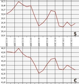 ЦБ РФ на 16 января 2010 года повысил курс доллара США до 29,5603 рубля, а курс евро понизил до 42,5905 рубля. На торгах ЕТС ММВБ средневзвешенный курс доллара с расчетами "завтра" вырос до 29,5517 рубля, евро -уменьшился до 42,5512 рубля.Банк России на 16 января установил официальный курс доллара США к рублю на отметке 29,5603, что на 13 копеек выше предыдущей цены - 29,4299 рубля. Одновременно был понижен официальный курс евро - на 18 с лишним копеек, с 42,7764 рубля до 42,5905 рубля.
