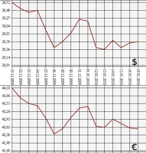 Банк России на 19 января 2010 года понизил курс евро до 42,5654 рубля, а курс доллара США повысил - до 29,5963 рубля. На торгах ЕТС ММВБ средневзвешенный курс евро с расчетами "завтра" вырос до 42,5766 рубля, курс доллара - до 29,6075 рубля.