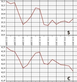Банк России на 21 января 2010 года повысил курс доллара США до 29,6941 рубля, а курс евро понизил - до 42,1478 рубля. На торгах ЕТС ММВБ средневзвешенный курс доллара с расчетами "завтра" вырос до 29,6815 рубля, курс евро упал до 42,0865 рубля.