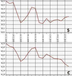 Центробанк на 22 января 2010 года повысил курс доллара США до 29,7486 рубля, а курс евро понизил до 41,9485 рубля. На торгах ЕТС ММВБ средневзвешенный курс доллара с расчетами "завтра" увеличился до 29,7795 рубля, евро упал до 41,9004 рубля.