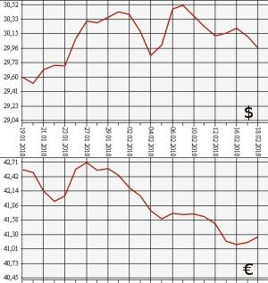 Результаты единой торговой сессии межбанковской валютной биржи показали аналогичную динамику. По итогам торгов ЕТС на ММВБ 17 февраля средневзвешенный курс доллара США с расчетами "завтра" упал более чем на 14 копеек - с 30,1282 рубля до 29,9851 рубля. Курс евро, напротив, вырос почти на 6 копеек - с 41,1487 рубля до 41,2054 рубля.