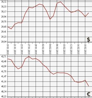 По итогам единой торговой сессии (ЕТС) на ММВБ 18 февраля, средневзвешенный курс доллара США с расчетами "завтра" вырос почти на 11 копеек - с 29,9851 рубля до 30,0948 рубля. Курс евро составил 40,8528 рубля, потеряв более 35 копеек по сравнению с результатом предыдущих торгов - 41,2054 рубля 17 февраля.