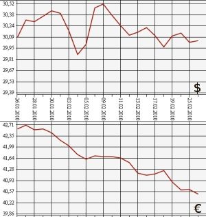 Результаты единой торговой сессии межбанковской валютной биржи показали аналогичную динамику. По итогам торгов ЕТС на ММВБ 25 февраля, средневзвешенный курс доллара США с расчетами "завтра" увеличился более чем на 3 копейки - с 30,0242 рубля до 30,0582 рубля. Курс евро с расчетами "завтра" составил 40,5315 рубля, потеряв 11 копеек с небольшим (по сравнению с результатом предыдущих торгов - 40,6434 рубля).