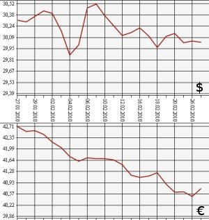 Банк России на 27 февраля 2010 года повысил курс евро к рублю до 40,7566 рубля, а курс доллара США понизил - до 30,0388 рубля. Средневзвешенный курс евро с расчетами "завтра" на торгах ЕТС ММВБ вырос до 40,7573 рубля, курс доллара упал до 30,0044 рубля.По данным Центробанка, на 27 февраля официальный курс доллара США к рублю понижен более чем на 1 копейку - с 30,0521 рубля до 30,0388 рубля. Одновременно официальный курс евро к рублю повышен - почти на 25 копеек, с 40,5012 рубля до 40,7566 рубля.