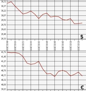 Результаты единой торговой сессии межбанковской валютной биржи показали аналогичную динамику. По итогам торгов ЕТС на ММВБ 5 марта, средневзвешенный курс доллара США с расчетами "завтра" составил 29,8317 рубля, прибавив 3 копейки по отношению к предыдущему результату (29,8016 рубля). Средневзвешенный курс евро, напротив, упал - на 21 копейку, с 40,7310 рубля до 40,5201 рубля.
