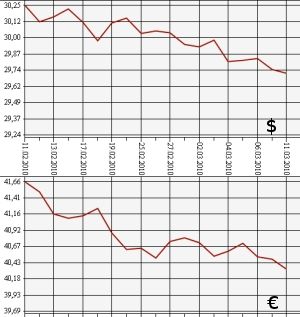 Результаты единой торговой сессии межбанковской валютной биржи показали аналогичную динамику. По итогам торгов ЕТС на ММВБ 10 марта, средневзвешенный курс доллара США с расчетами "завтра" уменьшился более чем на 9 копеек - с 29,7565 рубля до 29,6638 рубля. Средневзвешенный курс евро составил 40,3342 рубля. Это более чем на 8 копеек ниже результата предыдущих торгов (40,4199 рубля 9 марта).