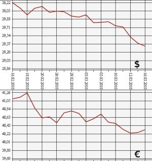 Стоимость бивалютной корзины (0,45 евро и 0,55 доллара) таким образом снизилась незначительно - менее чем на одну копейку, с 34,2817 рубля до 34.2816 рубля.