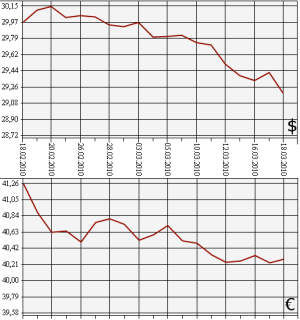 Торги на ЕТС ММВБ 17 марта продемонстрировали понижательную динамику. По итогам сессии средневзвешенный курс доллара США с расчетами "завтра" опустился сразу более чем на 22 копейки - с 29,3954 рубля до 29,1752 рубля. Средневзвешенный курс евро с расчетами "завтра" понизился более чем на 7 копеек - с 40,2474 рубля до 40,1723 рубля.