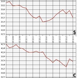 Банк России на 31 марта 2010 года понизил курс доллара США до 29,3638 рубля, а курс евро - до 39,7028 рубля. На торгах ЕТС ММВБ средневзвешенный курс доллара с расчетами "завтра" упал до 29,3990 рубля, курс евро - до 39,6738 рубля.