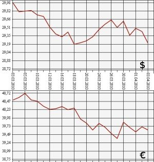 Банк России на 3 апреля 2010 года понизил курс доллара США до 29,2194 рубля и курс евро - до 39,6303 рубля. На торгах ЕТС ММВБ средневзвешенный курс доллара с расчетами "завтра" упал до 29,2188 рубля, евро - до 39,5802 рубля.По данным Центробанка, на 3 апреля официальный курс доллара США к рублю понижен на 22 копейки - с 29,4394 до 29,2194 рубля. Официальный курс евро также опустился - до 39,6303 рубля, что на 9 с лишним копеек ниже предыдущей цены - 39,7255 рубля 2 марта.