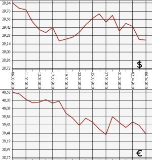 Центробанк на 6 апреля 2010 года понизил курс доллара США до 29,2097 рубля, а курс евро - до 39,3922. На торгах ЕТС ММВБ средневзвешенный курс доллара с расчетами "завтра" упал до 29,2003 рубля, курс евро - до 39,3471 рубля.