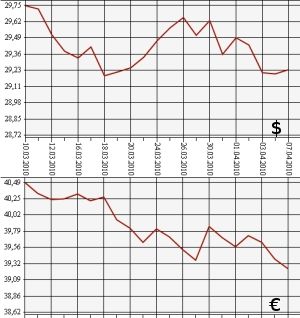 Банк России на 7 апреля повысил курс доллара США до 29,2416 рубля, а курс евро - понизил до 39,2568. На торгах ЕТС ММВБ средневзвешенный курс доллара с расчетами "завтра" вырос до 29,2756 рубля, курс евро упал до 39,2690 рубля.Центробанк РФ на 7 апреля 2010 года установил официальный курс доллара США к рублю на уровне 29,2416, что более чем на 3 копейки выше предыдущего - 29,2097 рубля. Официальный курс евро, напротив, понижен - более чем на 13 копеек, с 39,3922 до 39,2568 рубля.