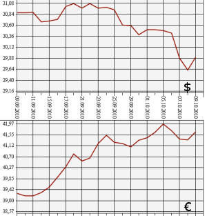 Банк России на 9 октября 2010 года повысил курс доллара США до 29,9086 рубля, а курс евро к рублю - до 41,6717 рубля. На торгах ЕТС ММВБ средневзвешенный курс доллара с расчетами "завтра" вырос до 29,9497 рубля, курс евро - до 41,6542 рубля.По данным Центробанка, на 9 октября официальный курс доллара США повышен более чем на 27 копеек - с 29,6334 рубля до 29,9086 рубля. Официальный курс евро также увеличен более чем на 31 копейку - с 41,3564 рубля до 41,6717 рубля.