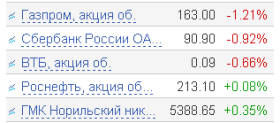В лидерах роста по итогам дня оказались бумаги "АВТОВАЗа" (+5,39%), значительный спрос наблюдался в акциях телекоммуникационного сектора: "ВолгаТелеком" вырос на 1,51%, "Сибирьтелеком" - на 1,46%. В роли "защитных" бумаг выступили "Полюс Золото" (+0,97%) и "Полиметалл" (+0,97%), которые воспользовались продолжающимся ралли в ценах на золото.