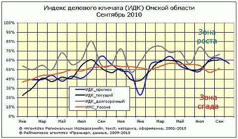В сентябре ИДК в Омске увеличился всего на 1 процентный пункт, составив 60%. Августовские ожидания экспертов, предвещавшие рост до 63%, не оправдались. Индекс делового климата в Омске все еще невысок и довольно медленно закрепляется в "зоне роста".