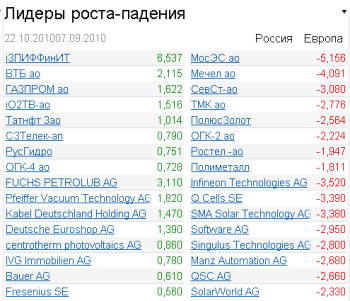 Лидерами роста вновь стали бумаги ВТБ(+2,1%). В акциях "Сбербанка" наблюдалась коррекция. Помимо банковских бумаг, восходящая динамика наблюдалась в котировках "Газпрома", выросших на 1,6%. Под конец торговой сессии более чем на 9% поднялись "префы" "АВТОВАЗа". Индекс РТС по итогам дня прибавил 0,24% и составил 1608.71 пункта, индекс ММВБ снизился на 0,58% до1519.3 пункта.
