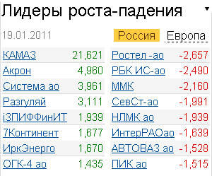 "Голубые фишки" 19 января ярких движений не показали, а вот во "втором эшелоне" были всплески котировок. Главной темой дня стали бумаги "КАМАЗа", которые взлетели на 21,62%. По мнению экспертов, такой рост объясняется общей тенденцией компаний производственного сегмента, в том числе - автопрома, на мировых рынках, также подъему могла способствовать информация о договоренности между Daimler AG и "КАМАЗом".
